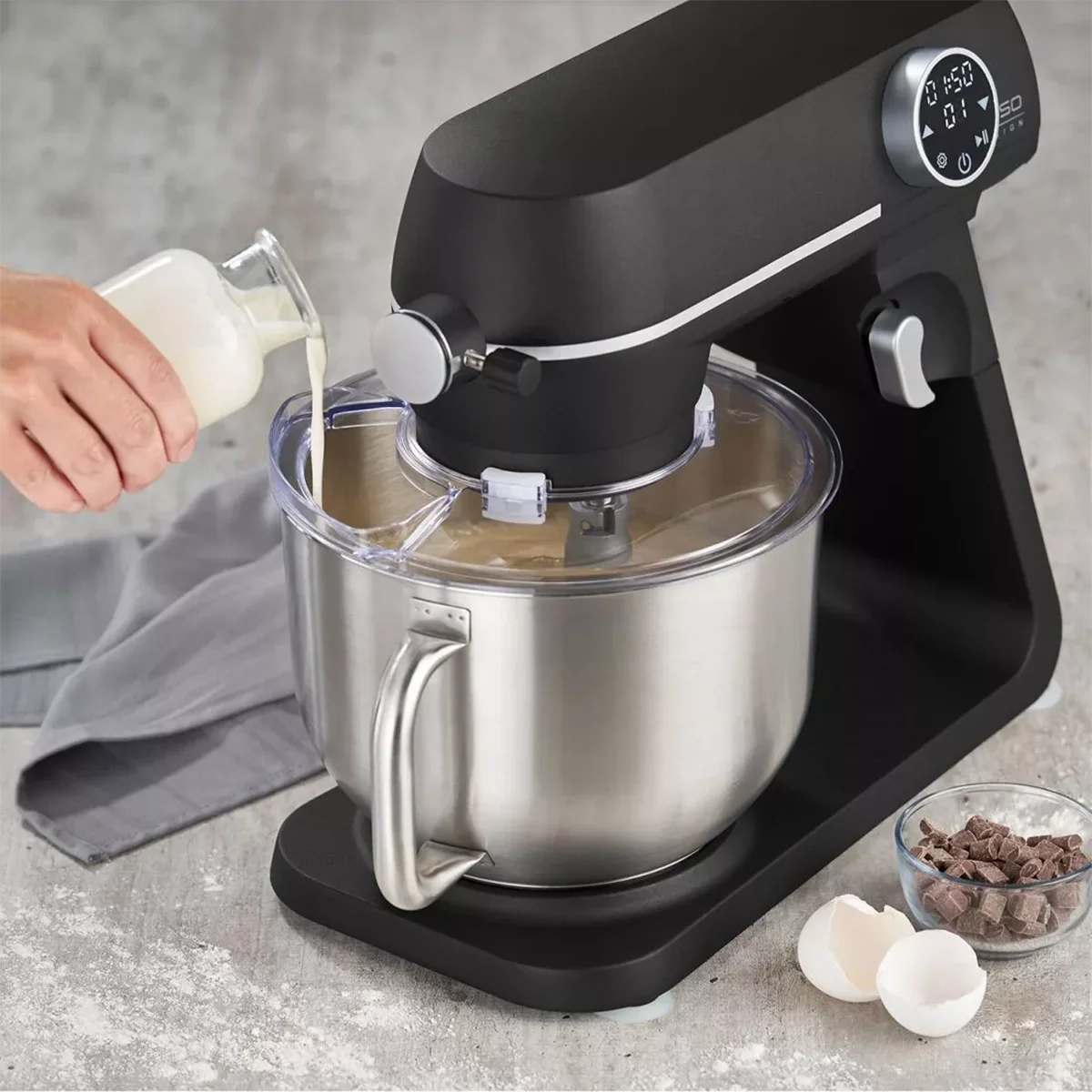 Die abnehmbare 6-Liter-Schüssel bietet ausreichend Platz auch für große Mengen. Das Zubehör-Set inklusive Knethaken, Flachrührer, Schneebesen, Spritzschutz mit Einfüllschacht und Teigschaber ist spülmaschinengeeignet – für maximale Bequemlichkeit.
