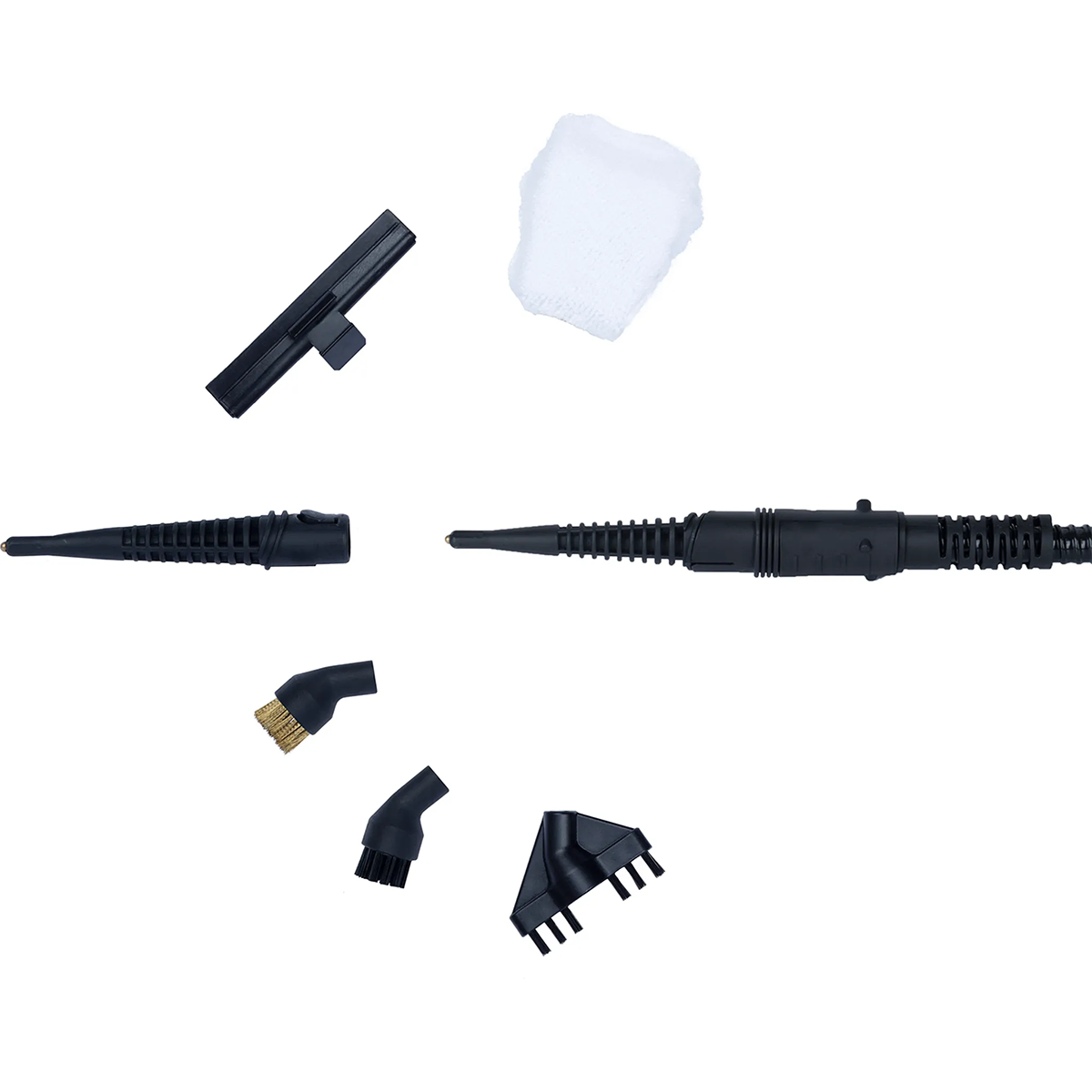 Zubehör: Mikrofasertuch (maschinenwaschbar), kleiner Reinigungskopf, Fensterabzieher, konische Dampflanze, flexibler Schlauch, Rundbürste, Drahtbürste, Kammbürste